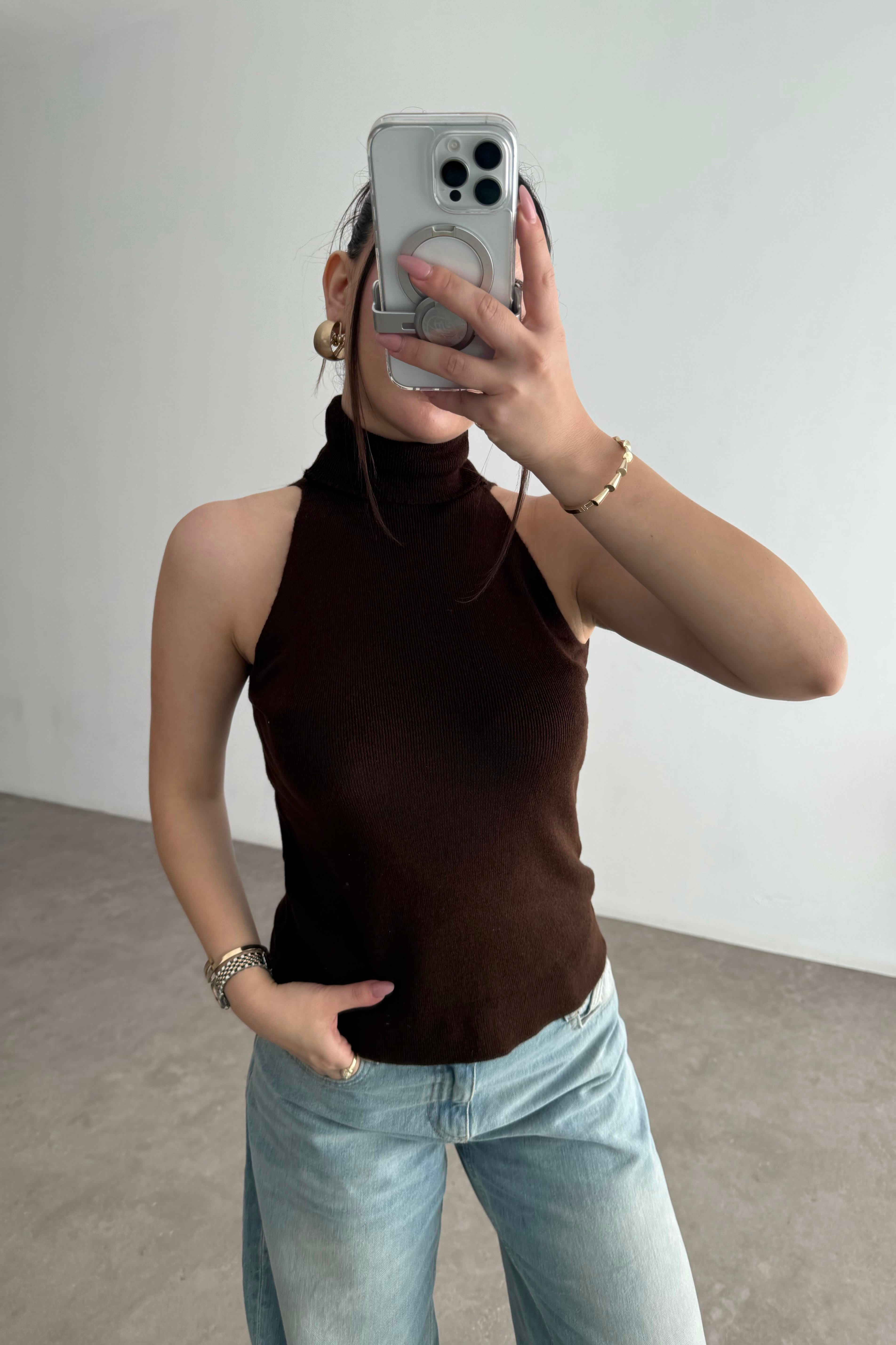 Balıkçı Yaka Sıfır Kollu Triko Kahve Bluz