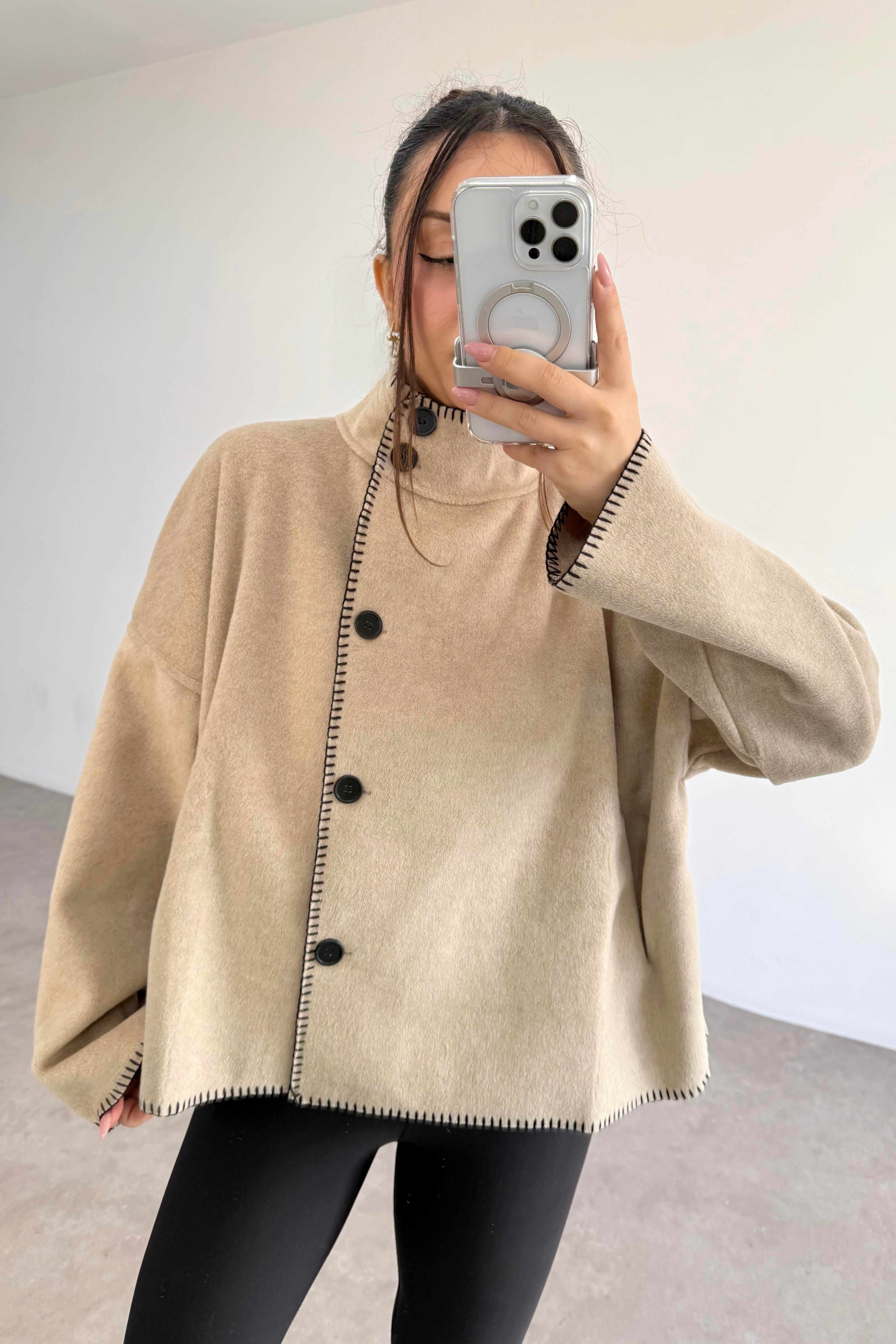 Dik Yakalı Düğmeli Cepli Tüylü Overloklu Üst
