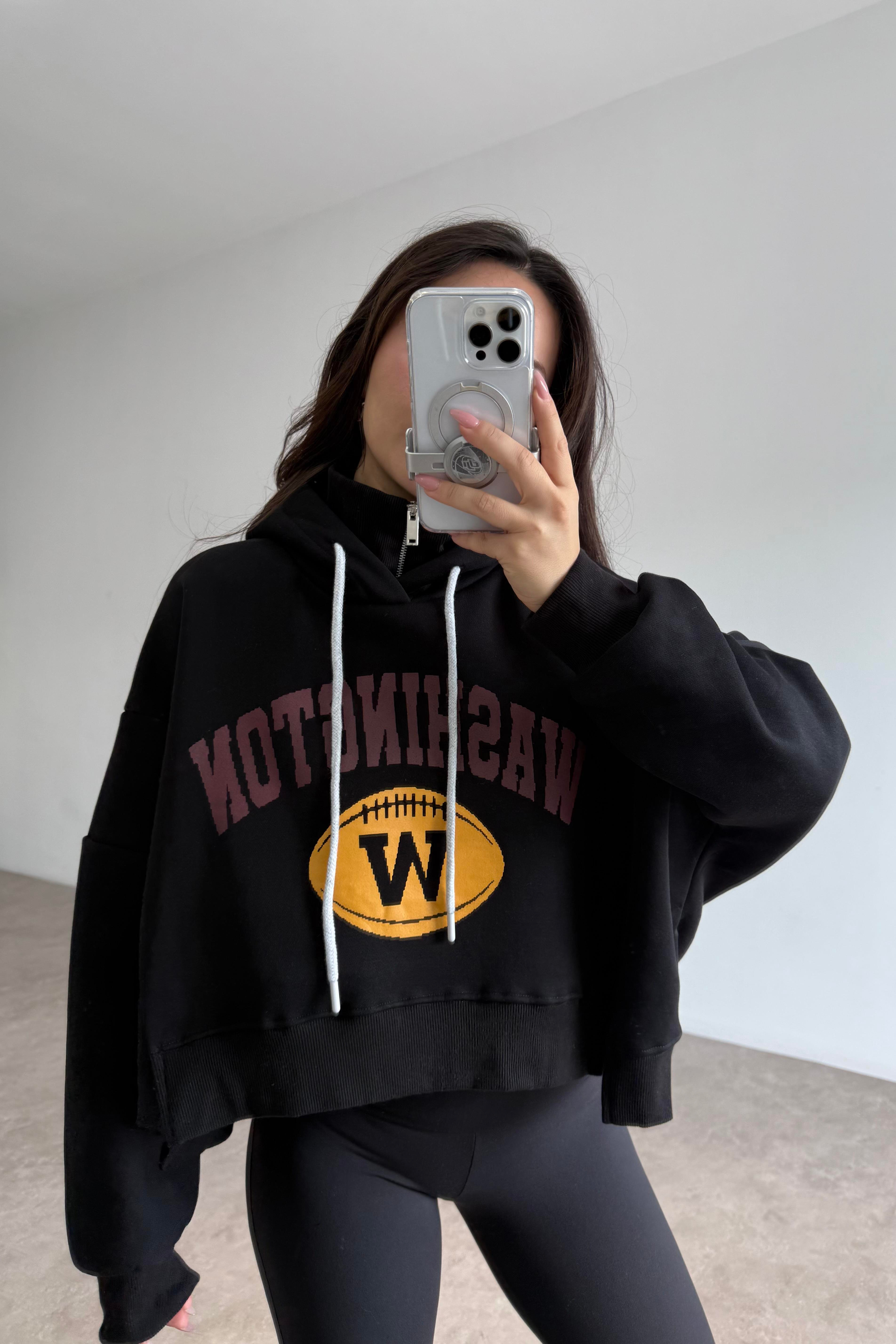 Dik Yakalı Kapüşonlu Kalın Şardonlu Siyah Sweatshirt