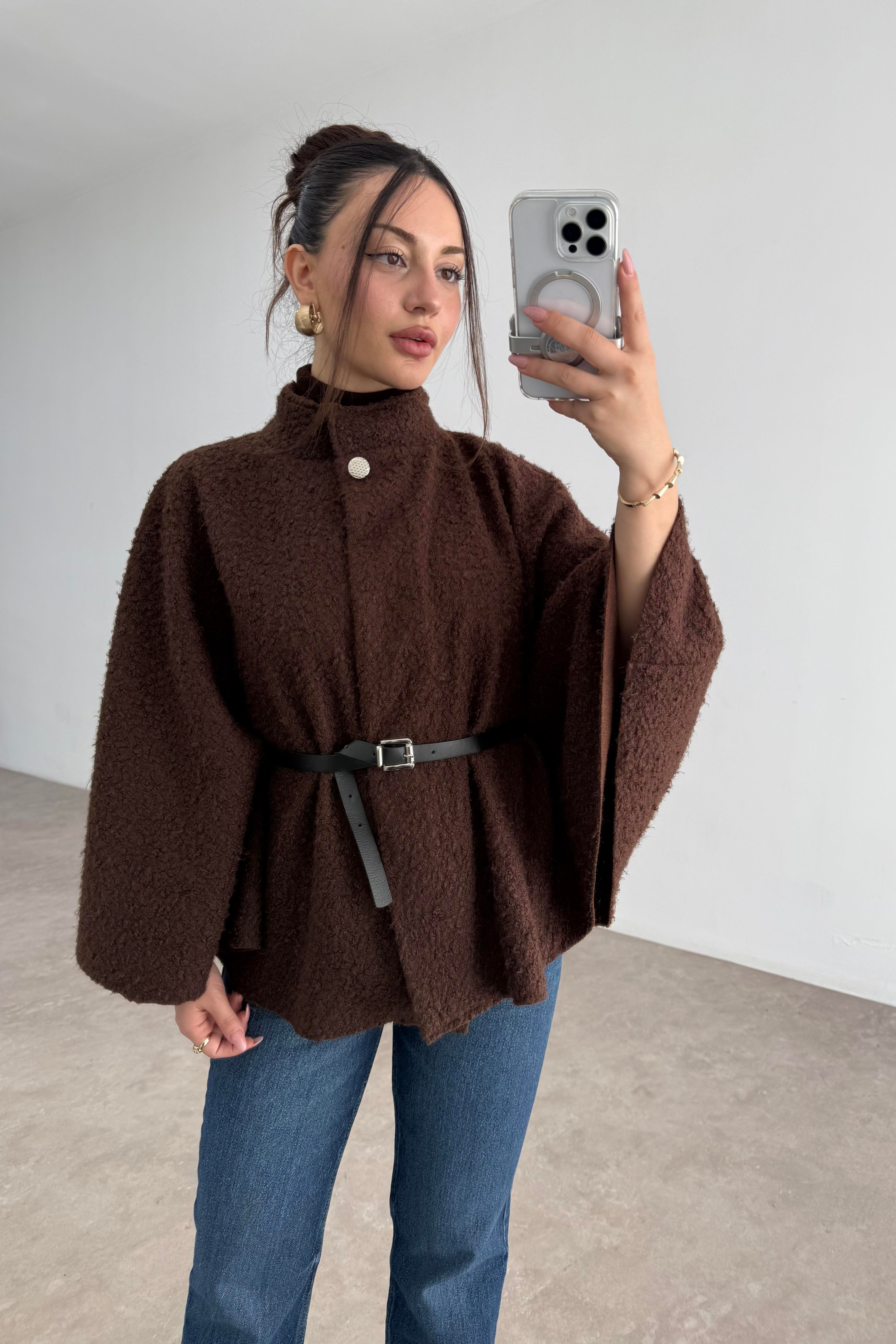 Dik Yakalı Kemerli Teddy Kumaş Kahve Panço