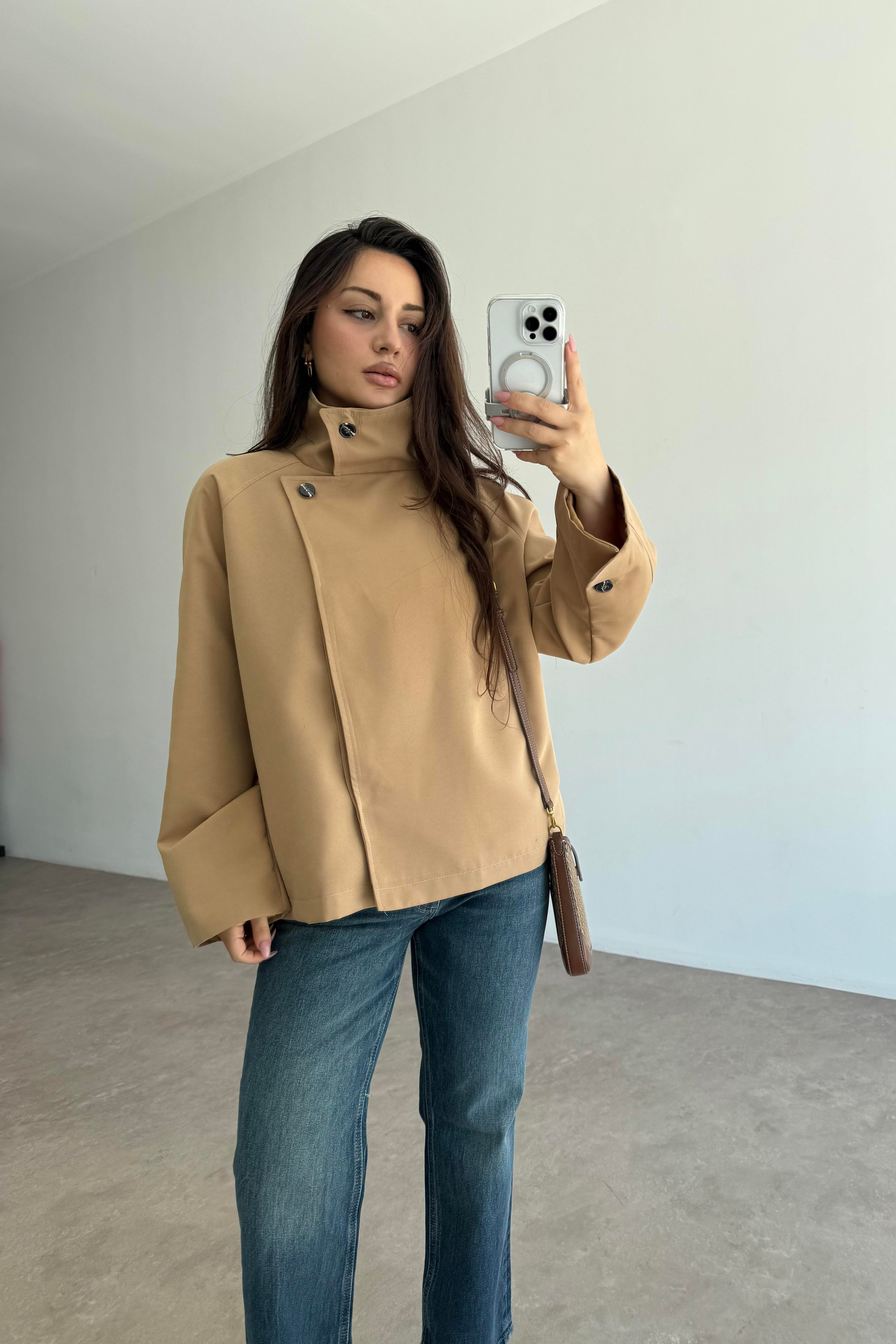 Dik Yakalı Premium Kalite Kısa Camel Trençkot
