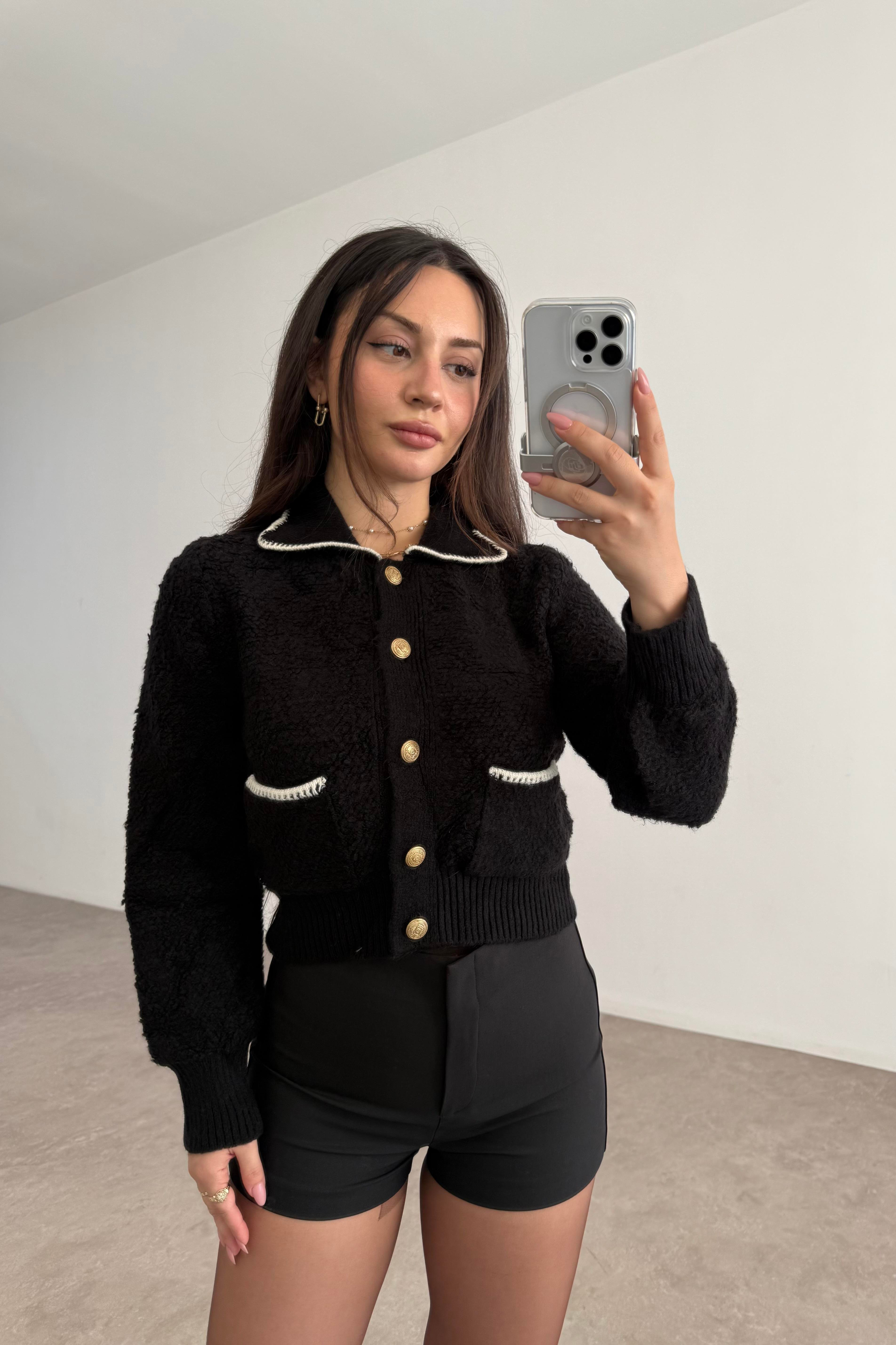 Mng Orijnal Yünlü Premium Yakalı Gold Düğmeli Siyah Hırka