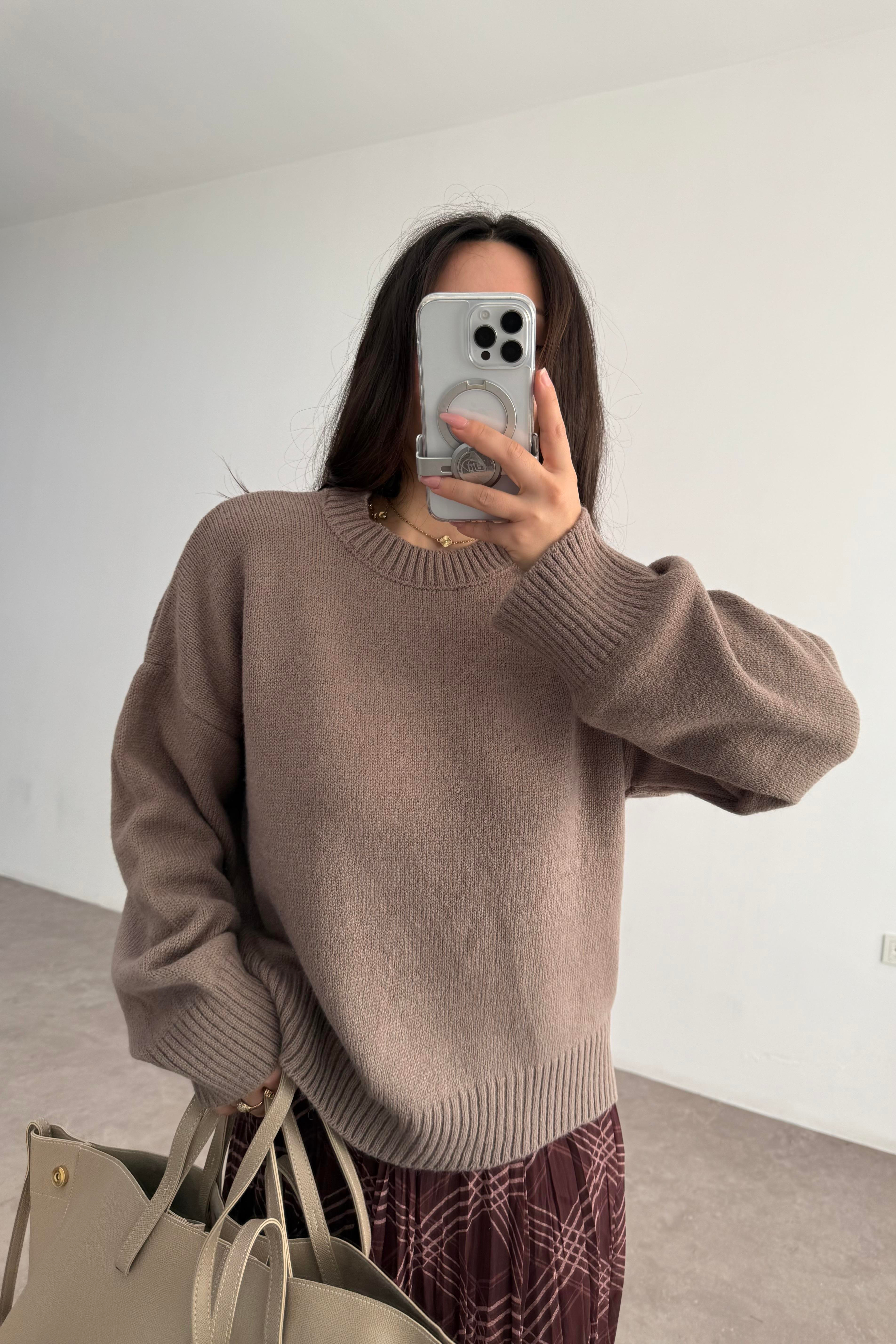 Mssmo Yuvarlak Yaka Triko Kazak Boz Kahve