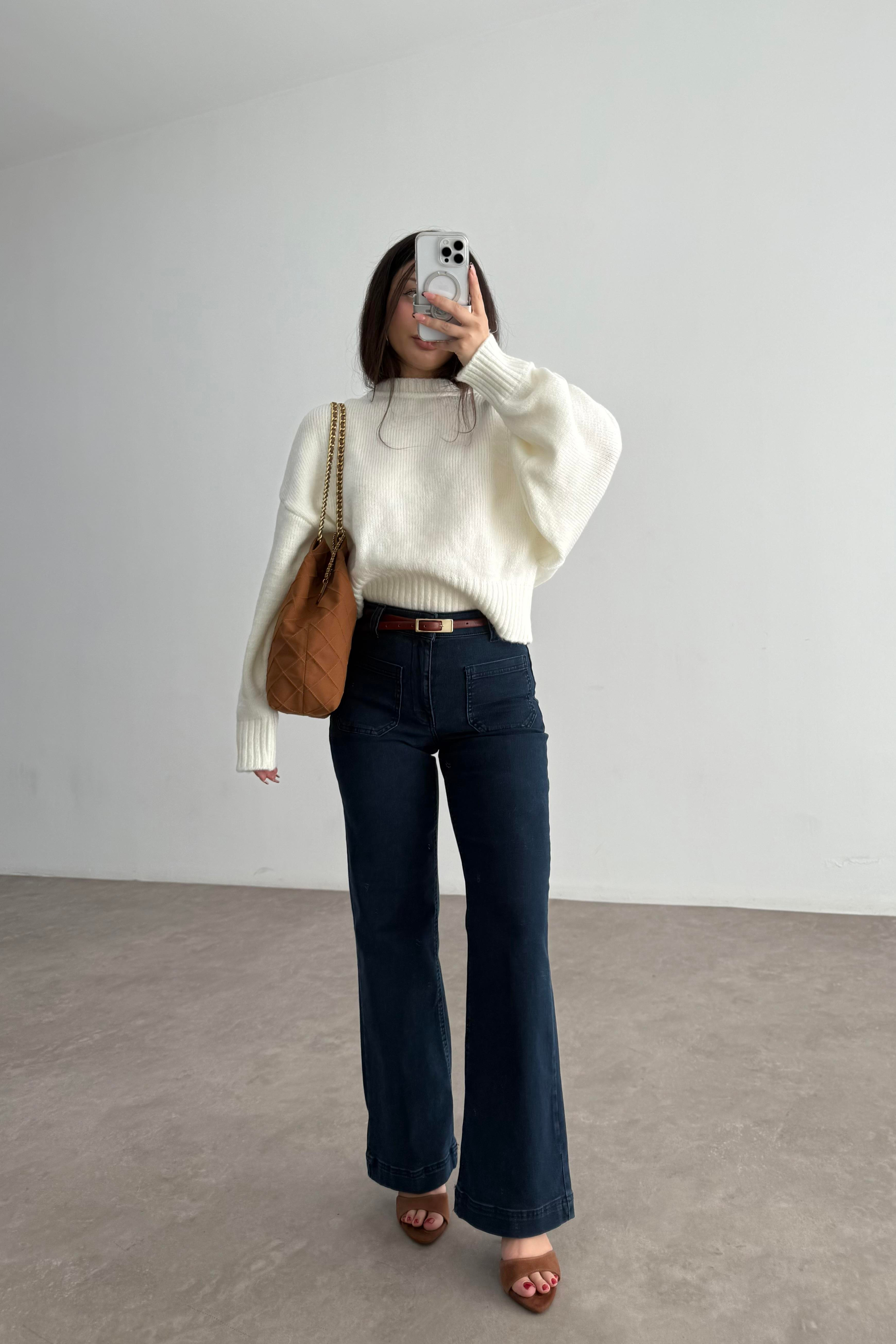 Büşra Doğramacı'nın özenle tasarladığı bu lacivert jean, yüksek bel kesimi sayesinde vücudunuzu kusursuzca sarar, daha uzun ve zarif bir siluet çizmenizi sağlar. Yüksek belin sunduğu toparlayıcı etki ve hareket özgürlüğü, gün boyu kendinizi rahat ve güvende hissetmenizi garantiler. Önü cep detaylı tasarımı ise klasik jean görünümüne modern ve özgün bir dokunuş katarak fark yaratır. Bu detay, hem estetik bir görünüm sunar hem de küçük eşyalarınız için pratik bir kullanım alanı sağlar.