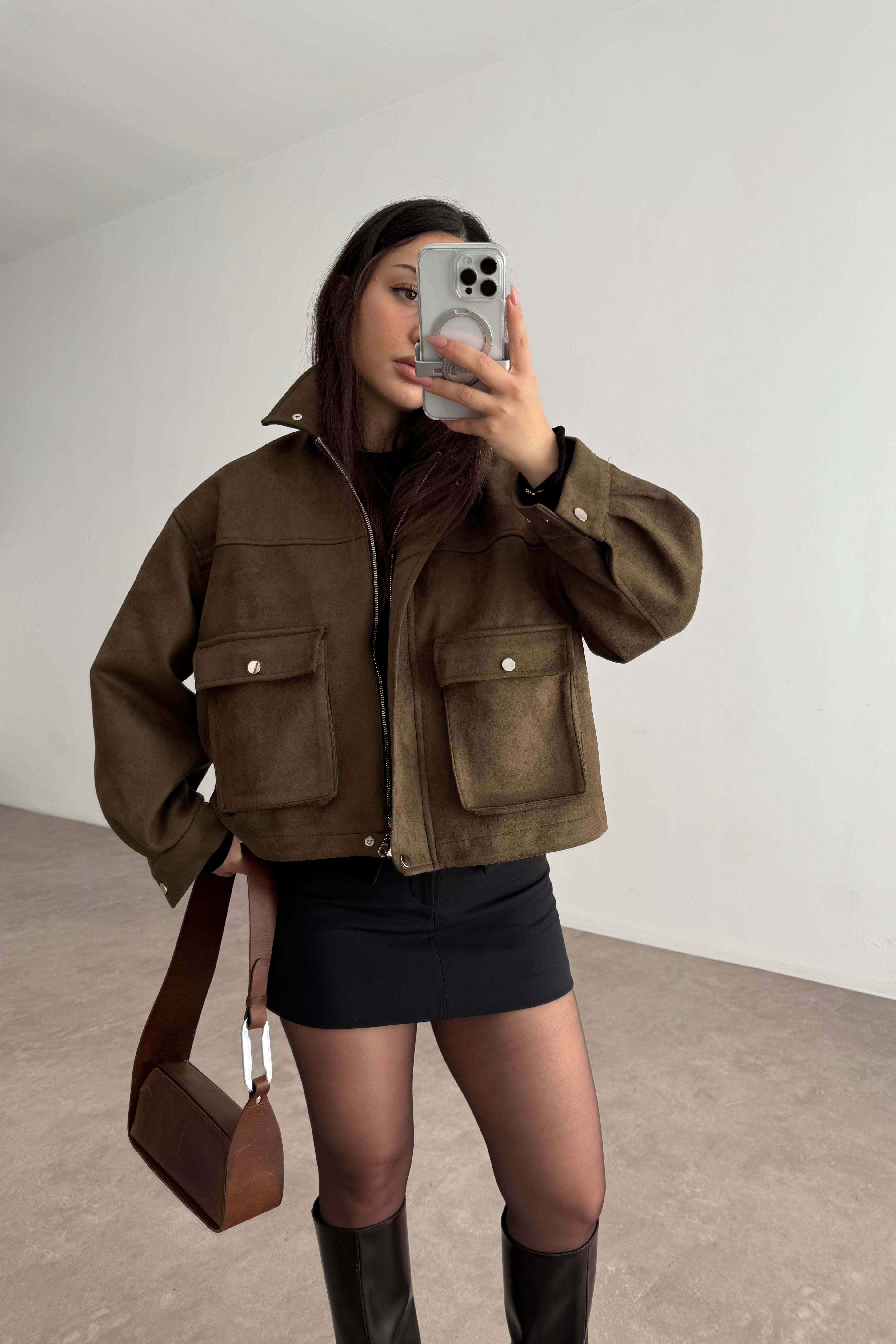 Premium Cep Detaylı Yakası Kemerli Süet Haki Ceket