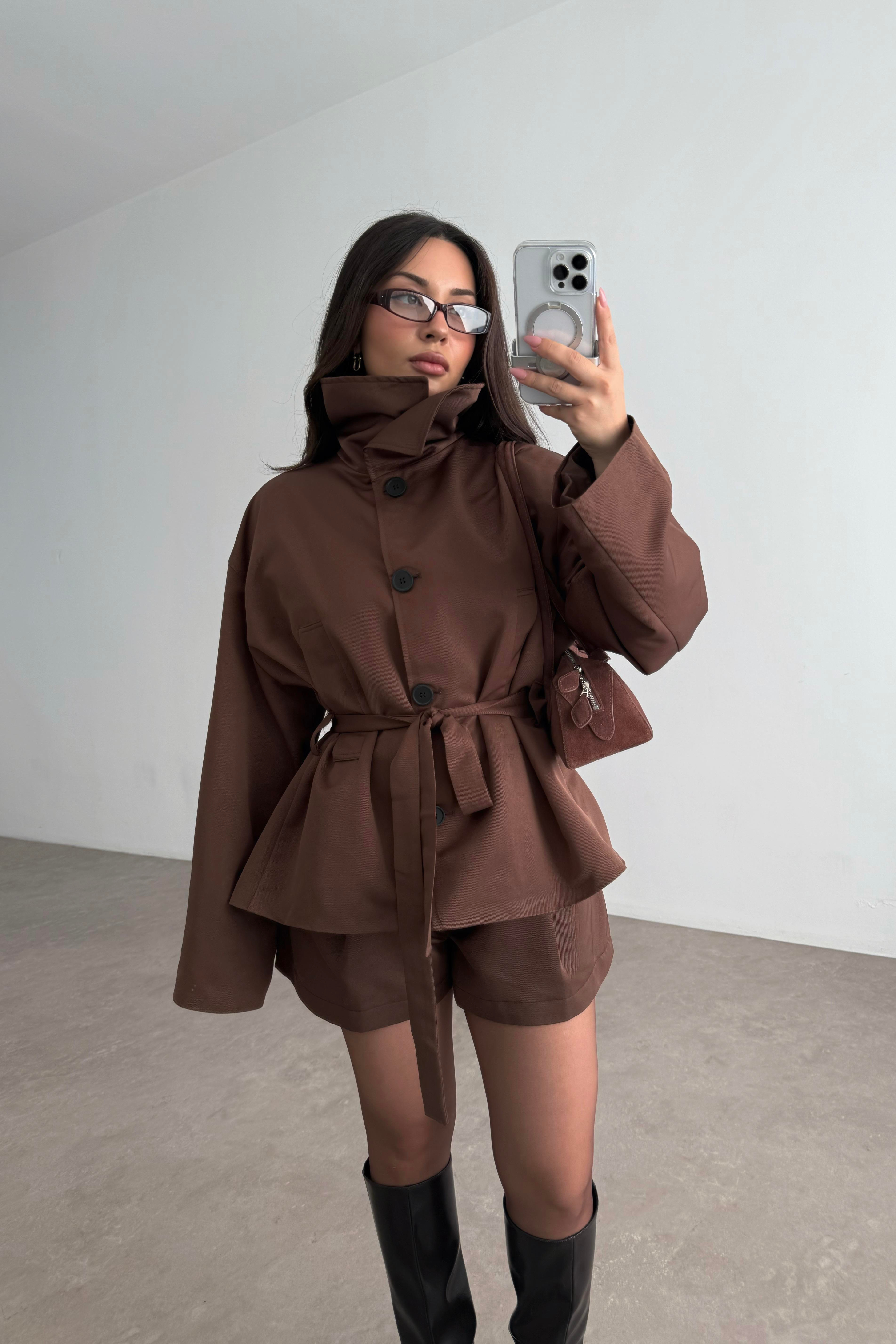 Premium Kalite Dökümlü Yaka Düğmeli Kahve Trençkot