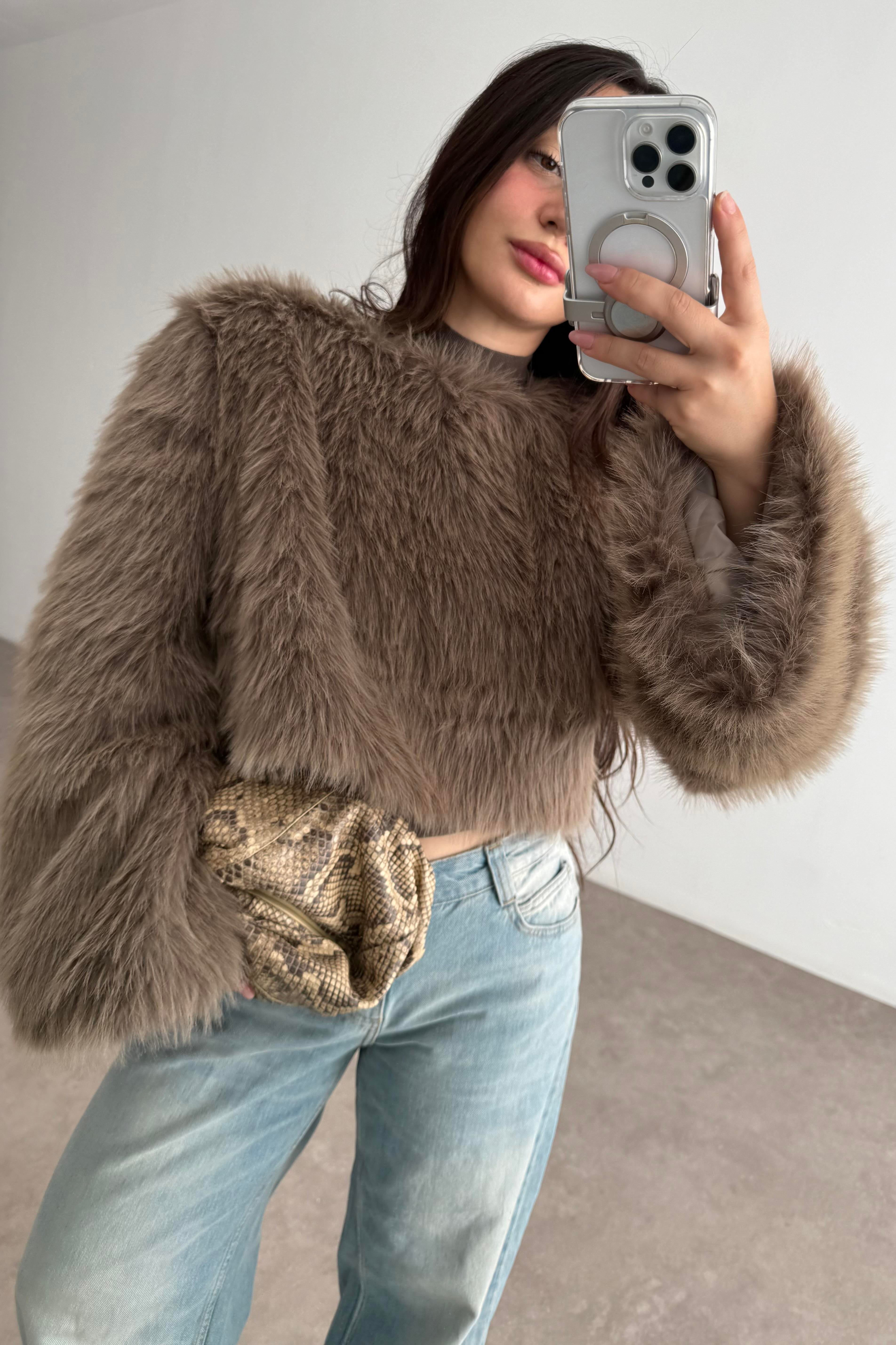 Sıfır Yaka Geniş Kollu Kürk Bluz Kahve